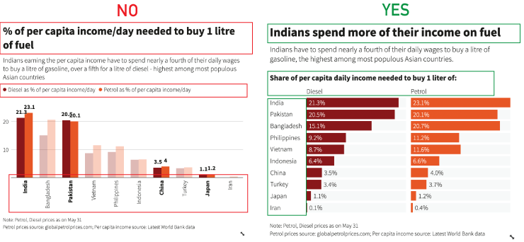 Share of daily income needed for 1 litre of: ◼︎ Diesel ◼︎ PetrolDon’t emphasize too many things.
