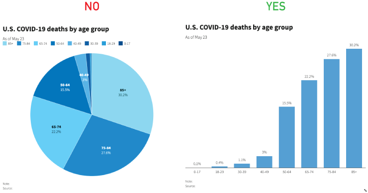 At Reuters Graphics, we’re not big fans of pie charts. Why? Our brains are bad at comparing the sizes of a pie’s slices to one another. The difference between 30% and 40%, for example, is not very dramatic when represented as a pie chart, but is often a VERY important difference to consider when making comparisons.